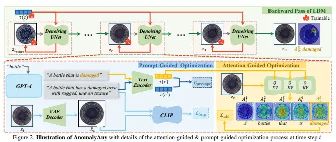 利用SD的“交叉注意力机制”,强化对“异常关键词”(如damaged、rusted)的聚焦区域,提升异常生成的相关性与真实性。