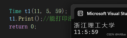 Time t1;//此处实例化t1,编译器会自动调用一个无参的构造函数,能打印浙江理工大学就说明调用了