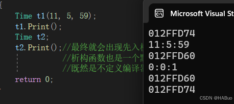 可以体现两个事情: 1. 先入栈的函数析构函数后调用,即函数后销毁 2. 析构函数是在main函数栈帧销毁时,即t1、t2所占用空间即将释放时所调用的并不是t1实例化之后就调用