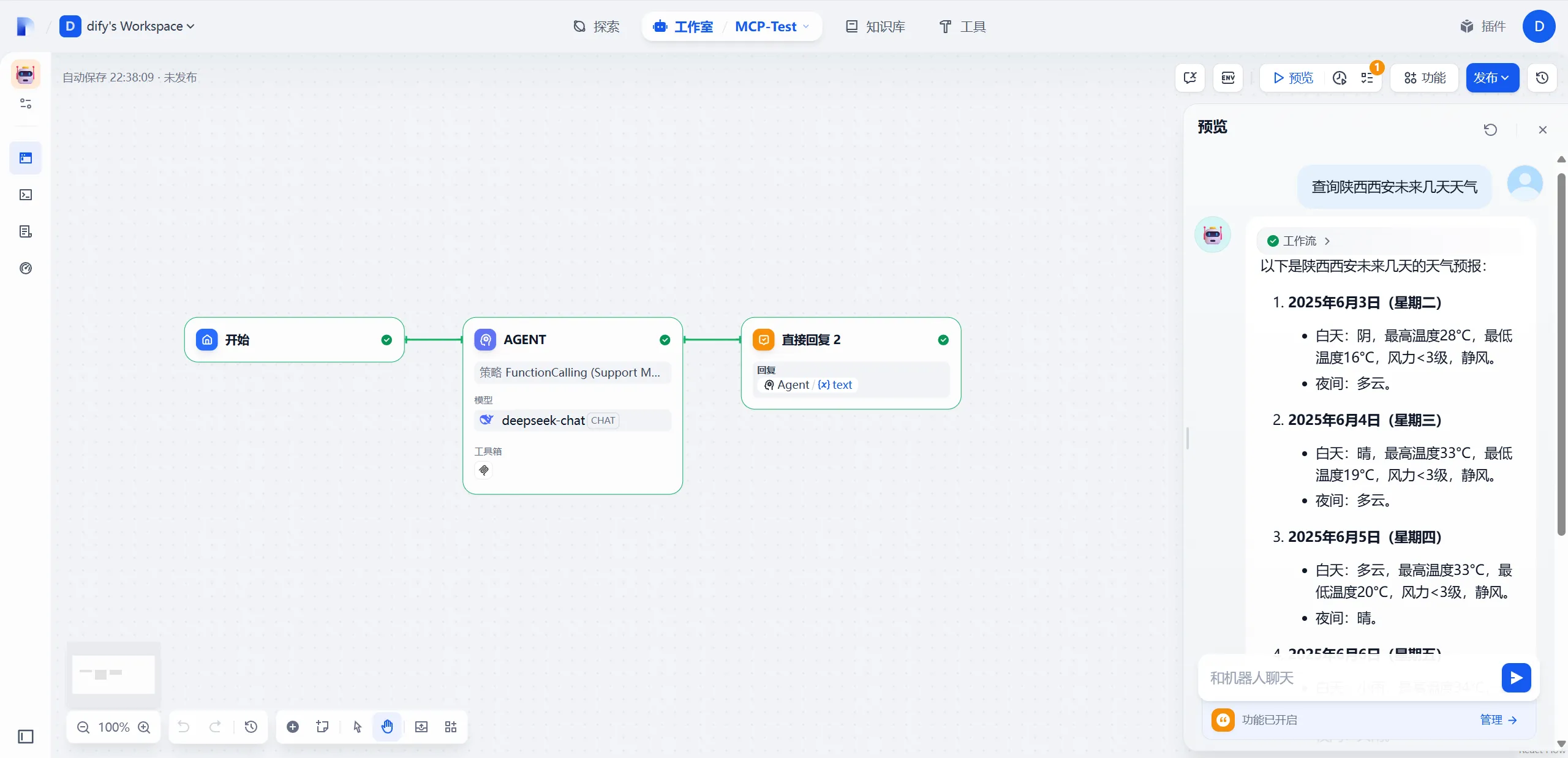 这种通讯方式实现最麻烦,有点大炮打蚊子的感觉,但也可以实现 Dify 调用 Java 程序,此时要求先试用 Java 程序,例如 Spring AI 实现一个 MCP 服务器端,然后再使用 Dify 添加支持 MCP 调用的 Agent 策略,来调用 Java 的 MCP 服务,如下图所示: