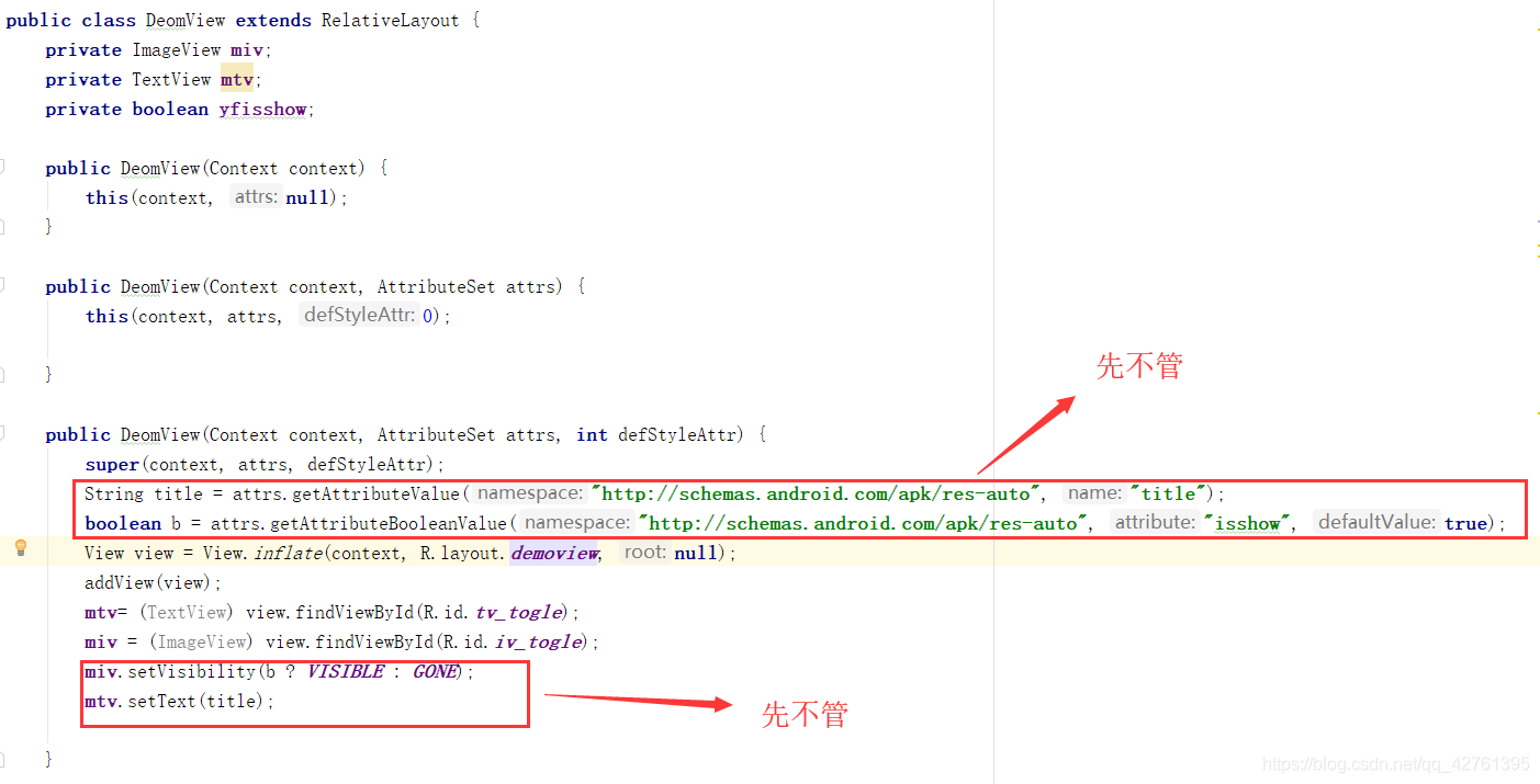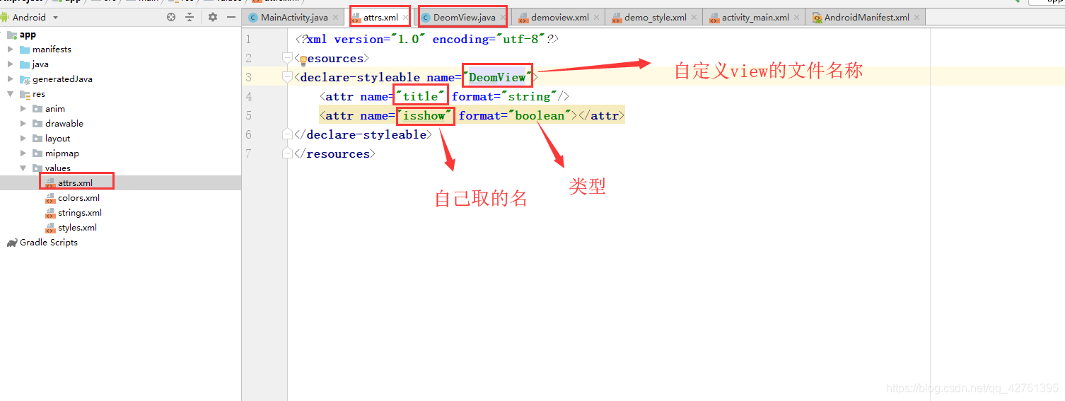 这个时候如果在Activity中运用的话,就是一个死的view,那么有没有什么办法,能改变里面的东西呢(改变文字&&设置ImageView是否显示) 这里就不得不提到文章标题中的attrs.xml文件了:如下图