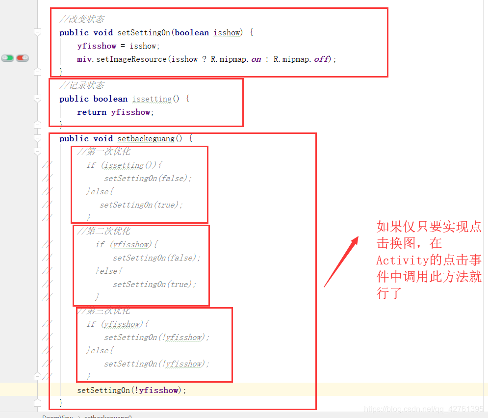 那么,那个boolean的值是用来干嘛的呢:控制图片是否显示–> miv.setVisibility(b ? VISIBLE : GONE);如果b为true则显示,为false则不显示。(拓展:了解一下VISIBLE :,GONE,INVISIBLE);