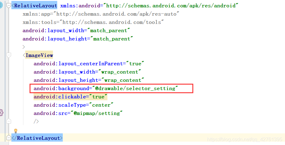 在控件中设置背景为selector_setting:(记得加clickable标签----->设置是否可以点击)