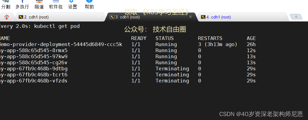 AI写代码bash1在 watch 的终端观察,开始的时候并没删除旧的 pod,而是创建好新的 pod 后,
