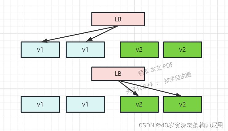 AI写代码bash1我们需要准备两个版本,一个蓝版本,一个绿蓝本,这两个版本同时存在,如下图所示:
