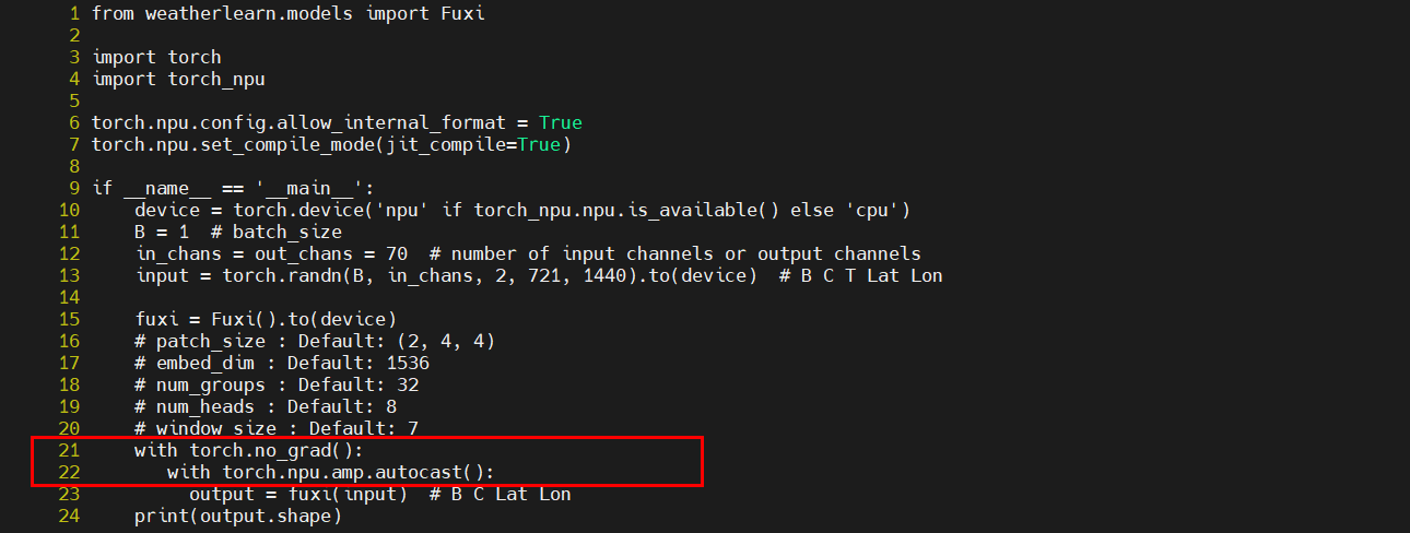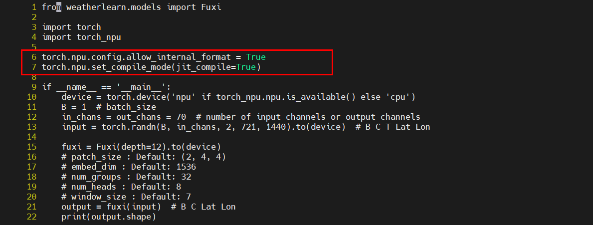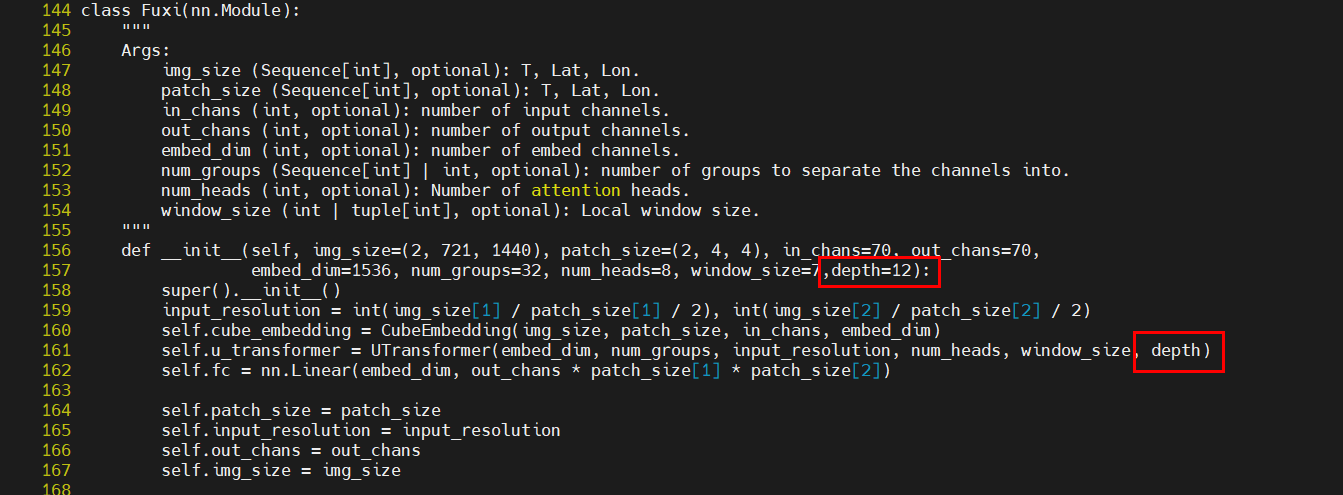 vi /WeatherLearn/weatherlearn/models/fuxi/fuxi.py在144行Fuxin类的初始化中添加参数depth=12,将161行的depth=48修改为depth
