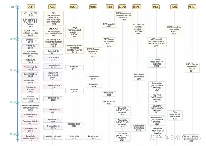 主要关注NSCLC中的驱动基因变异(也称为oncogene addiction),如KRAS、EGFR、间变性淋巴瘤激酶(ALK)、ROS1、BRAF、HER-2、MET、NTRK和RET突变,因为这些突变可以作为治疗靶点。然而,其他肿瘤相关基因如TP53、KEAP1、STK11和NF1的失活突变也很重要。