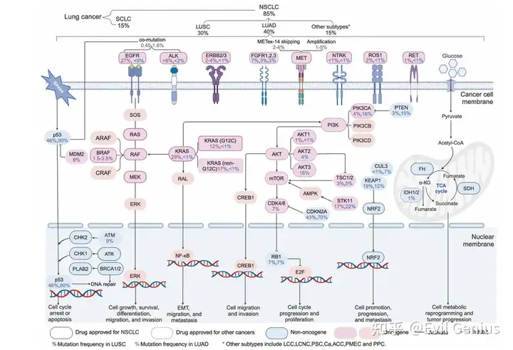 非小细胞肺癌(包括肺腺癌(LUAD)和肺鳞状细胞癌(LUSC))的发展是由异质性遗传和表观遗传改变驱动的,这是一个多步骤的复杂过程,涉及不同途径之间的各种信号传导串扰。在分子水平上,LUSC的特征是基因突变率高和染色体不稳定,然而,在某些患者亚群中存在一些特殊的突变。