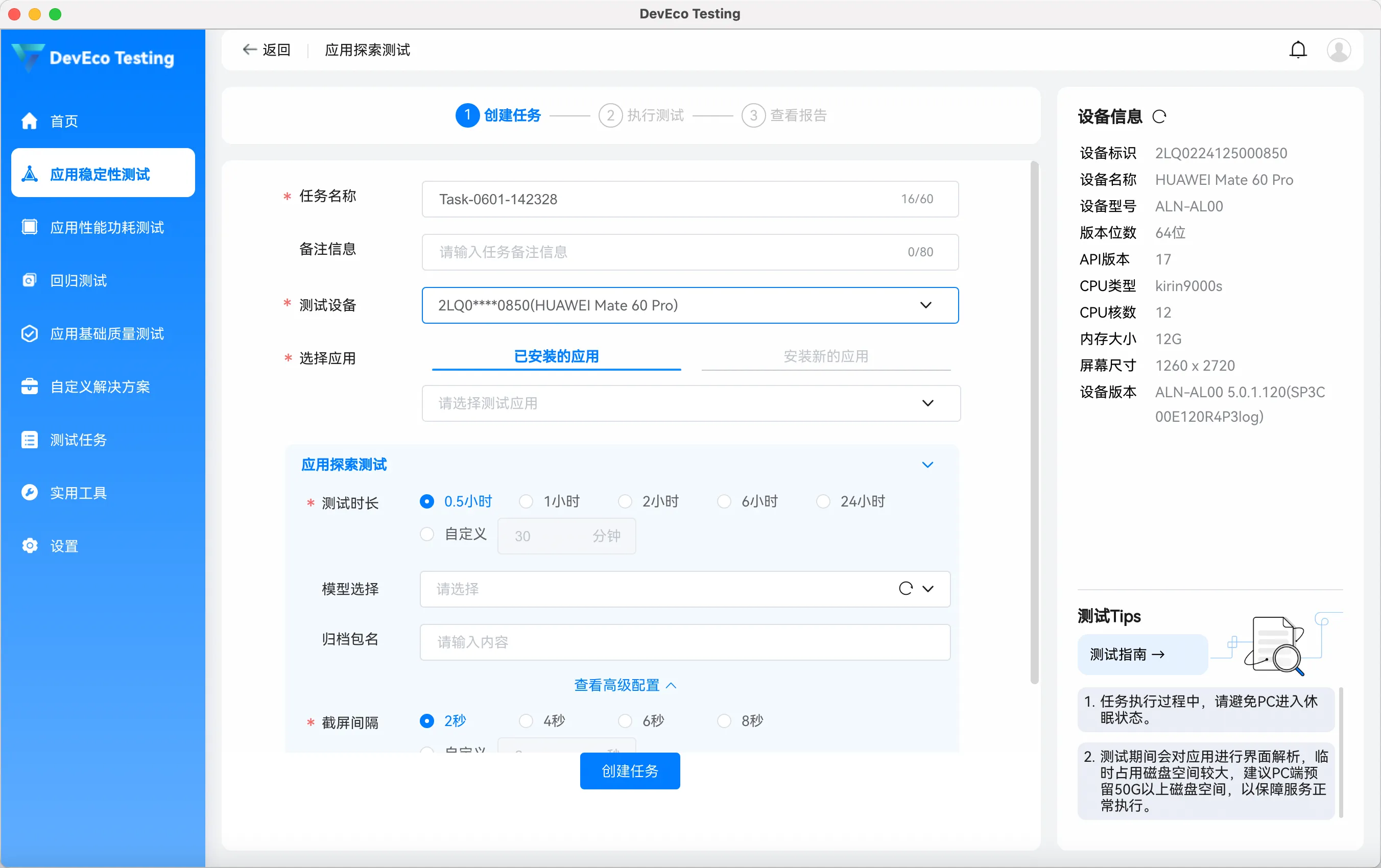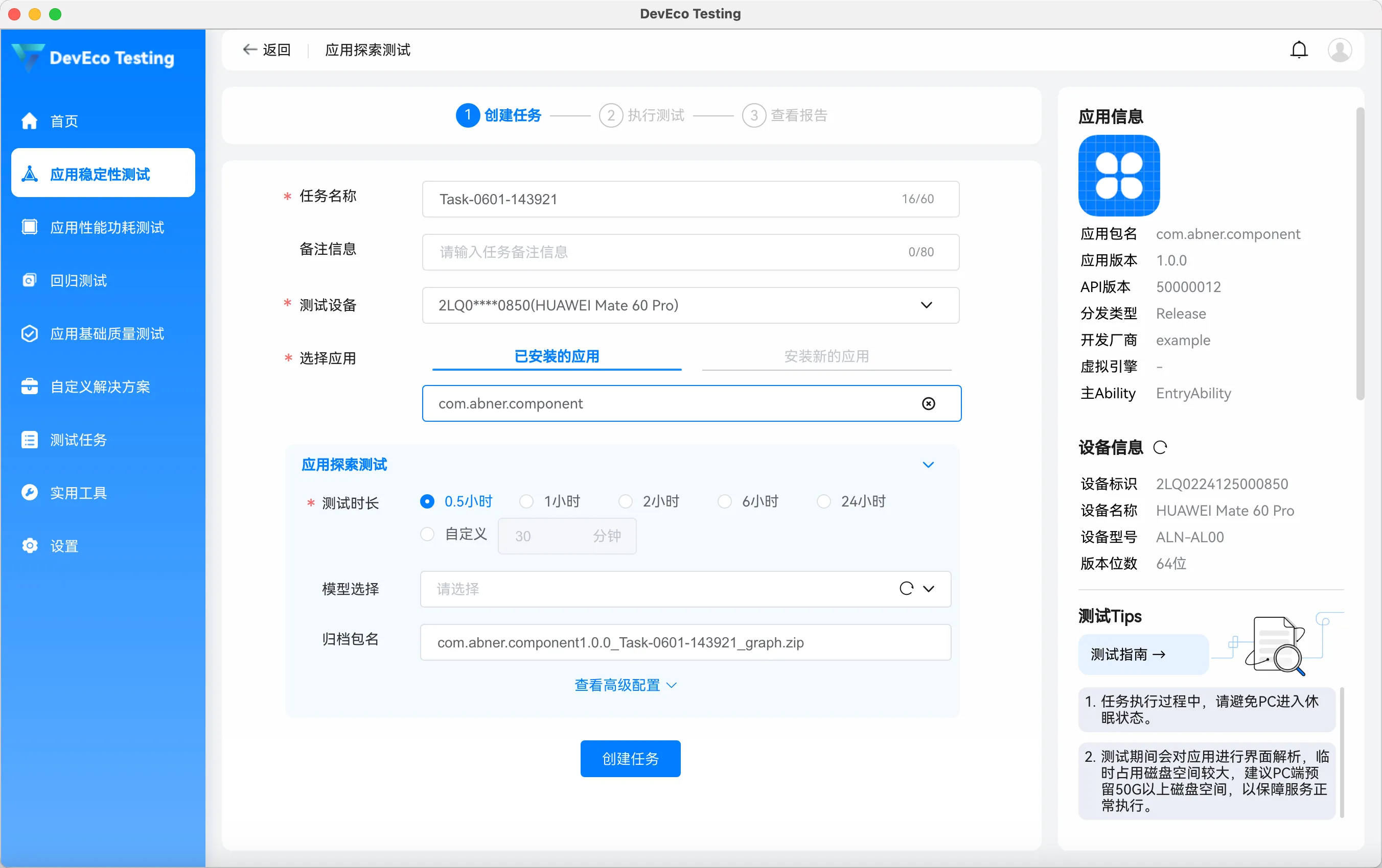 点击应用探索测试后,便到了创建任务的页面,也就是如下的页面: