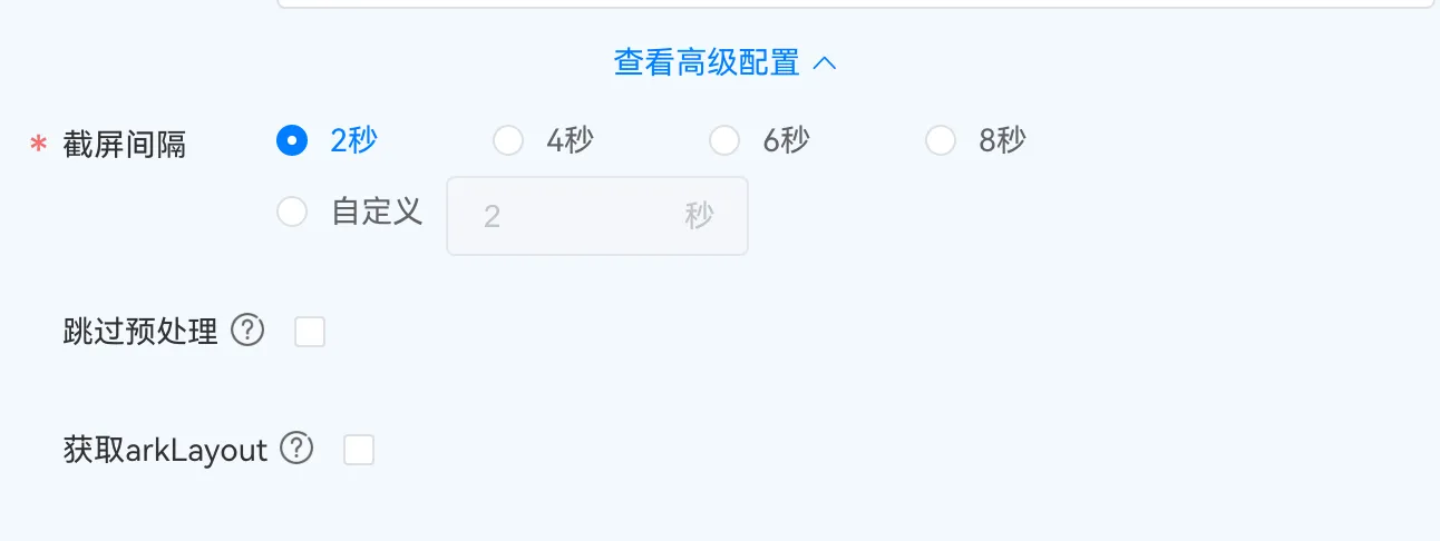 截屏间隔指的是操作后等待页面加载的时长,比如说,你设置的是2秒,则会在执行操作2秒后,获取页面截图再进行AI语义分析。有一个特殊情况需要知道,那就是web应用,可能会存在页面网络加载时延,或者应用的页面渲染时间较长,这种情况下,就需要我们,根据页面的延时,来针对性的设置截屏间隔。