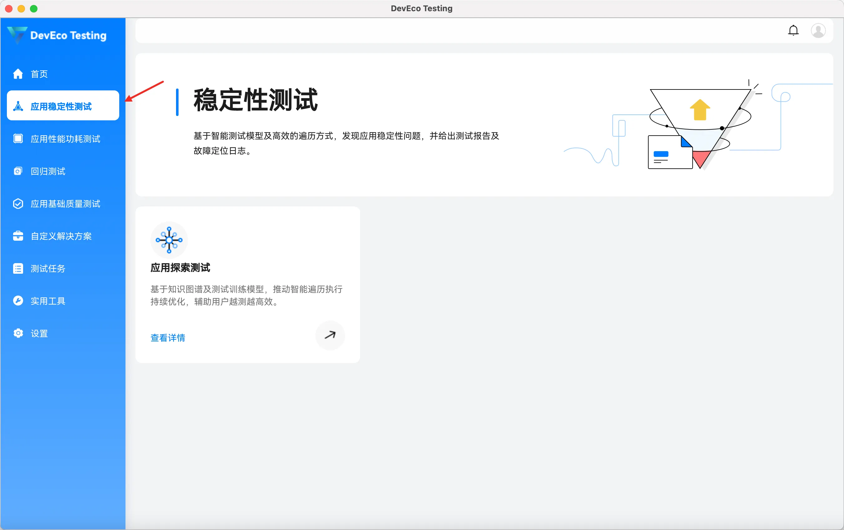 打开DevEcoTesting,第二个选项就是稳定性测试,点击后,目前只提供了一项测试能力应用探索测试,这也是这一篇文章的重点。
