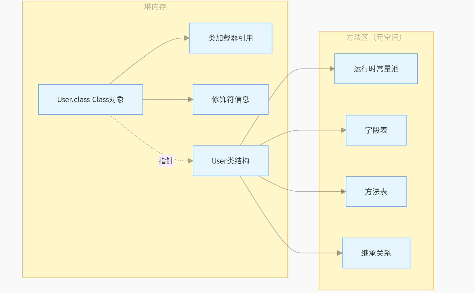 扩展:我们知道Clss对象在堆内存,而其运行时常量池,字段表,方法表,继承关系等都在元空间(方法区),同时这些东西又叫类结构。