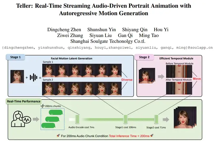 社交平台Soul App的研究团队提出了一种实时音频驱动人像动画框架 “Teller” ,实现了视频生成的效率突破。该技术将任务分解为面部运动生成和高效身体运动生成两大模块。