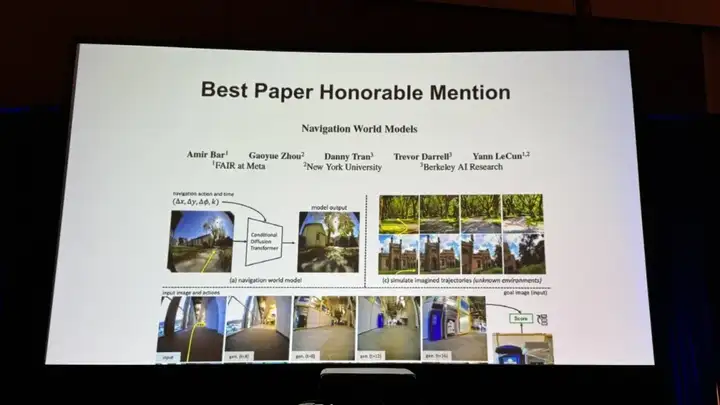 “世界模型”成为本届CVPR的热词之一。在自动驾驶专题研讨会上,Yann LeCun团队的“导航世界模型”(Navigation World Models)获得最佳论文提名。