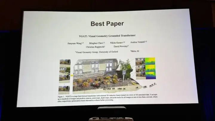 本届CVPR最大亮点当属3D视觉技术的突破性进展。获得最佳论文的VGGT(视觉几何基础Transformer)由牛津大学与Meta的华人博士生王建元领衔开发。