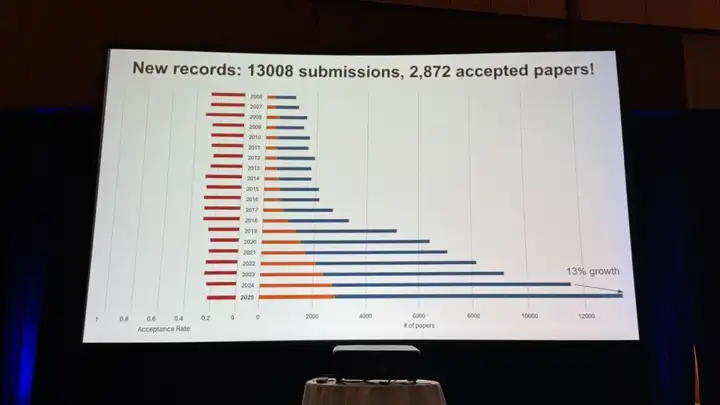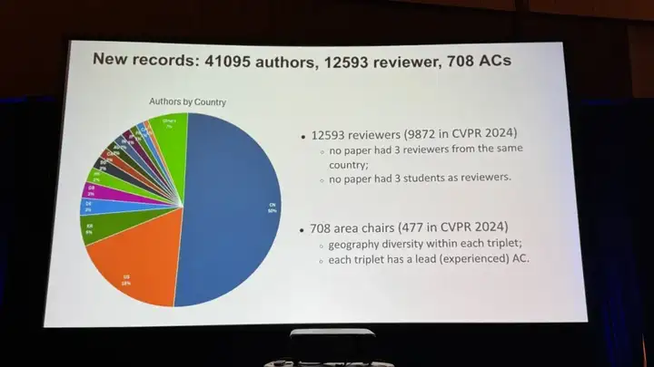 今年CVPR投稿数量再创历史新高——13008篇有效投稿,经过严格评审,最终2878篇论文被接收,接收率约22.1%。在接收论文中,仅有96篇获得口头报告资格,占比不到0.7%。参会人数同样惊人:来自70多个国家和地区的9000多名学者涌入纳什维尔会场。