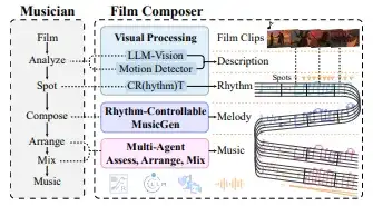 上海电影学院团队则开创性地将AIGC技术应用于电影配乐,其 FilmComposer框架 能根据电影片段自动生成专业级配乐,实现音画在语义、节奏和进展上的精确对齐。