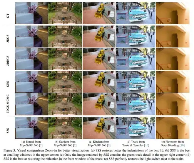 另一项引人注目的3D创新是“3D学生飞溅与挖掘技术”(Student Splatting and Scooping),由全华人团队开发。该技术打破了传统3D高斯泼溅的限制,通过正负密度组合显著提升了参数效率——在将组件数量减少82%的情况下仍能保持质量。