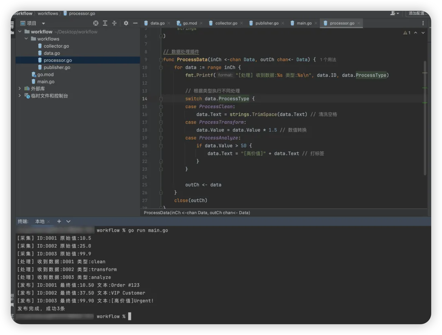 go workflows.ProcessData(collectCh, processCh) // 处理数据