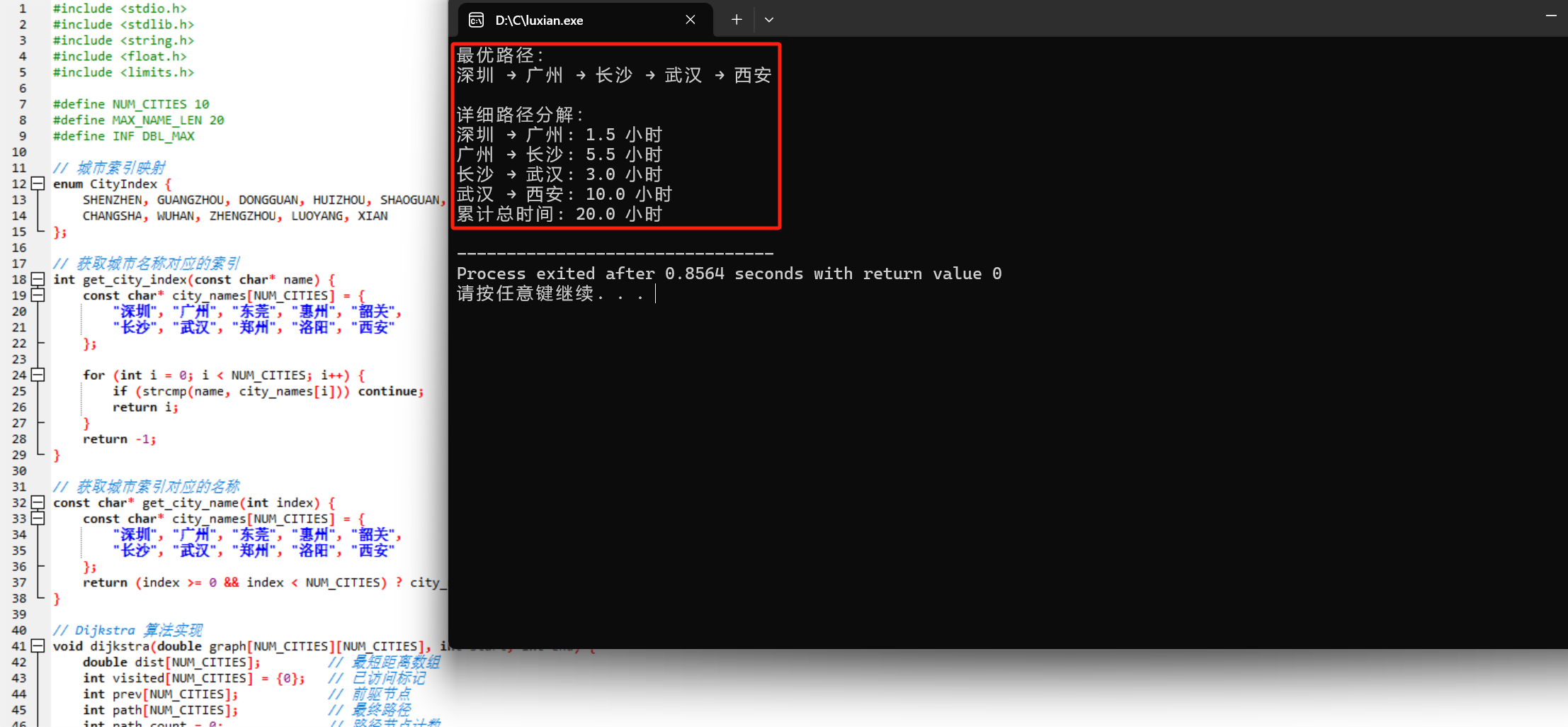 double graph[NUM_CITIES][NUM_CITIES];这种结构虽然空间复杂度较高(O(V²)),但对于中等规模城市网络(V=10)完全可接受,且具有以下优势: