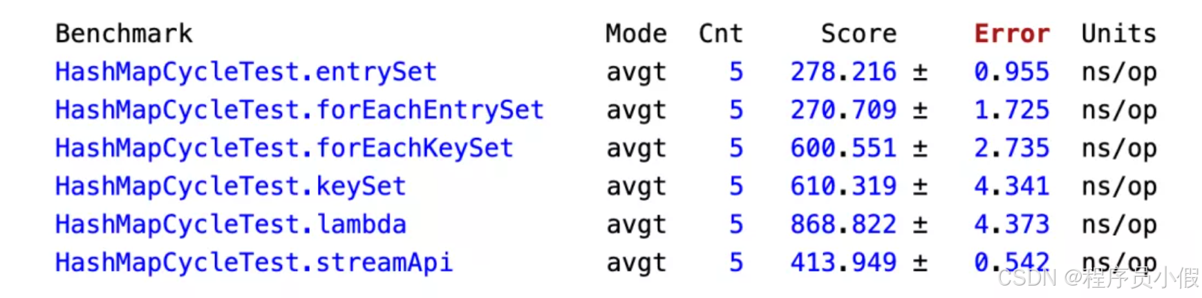 其中 Units 为 ns/op 意思是执行完成时间(单位为纳秒),而 Score 列为平均执行时间, ± 符号表示误差。从以上结果可以看出,两个 entrySet 的性能相近,并且执行速度最快,接下来是 stream ,然后是两个 keySet,性能最差的是 KeySet 。