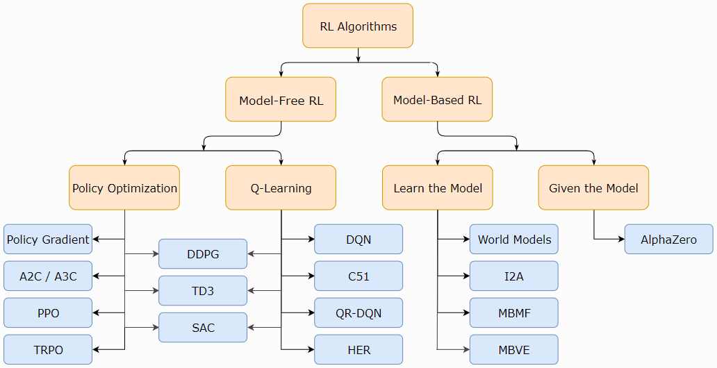 典型算法 | Dyna、PILCO、MCTS | DQN、PPO、A3C |