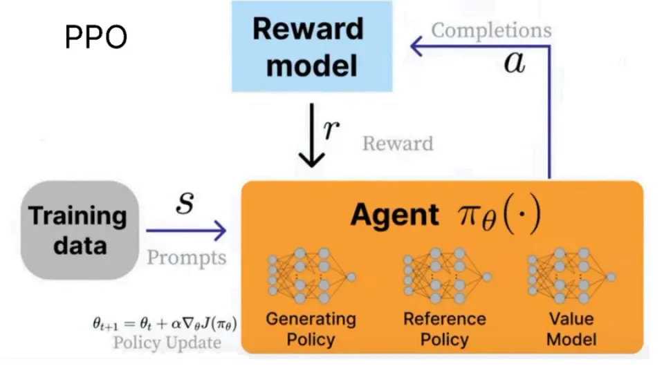 PPO(Proximal Policy Optimization,近端策略优化) ,一种强化学习算法,用于优化策略(Policy)。在 RLHF 中作为核心优化器,调整模型参数以最大化奖励。 没有 PPO,RLHF 仍可用其他算法(如 A2C、SAC);但没有 RLHF,PPO 只是一个通用 RL 算法。