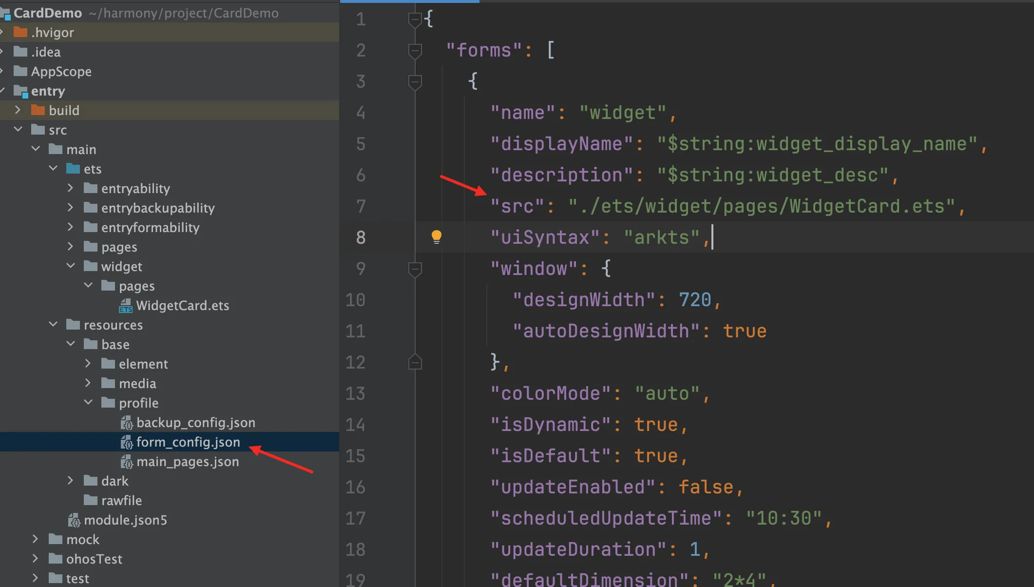 上篇文章,我们默认创建了一个卡片,所有的UI绘制,都是在widget中pages下的WidgetCard中进行绘制的,当然了,由于创建的文件名不一样,文件路径也有区别,我们可以从resources->base->profile->form_config.json中的src字段查看,这个就是我们的卡片UI视图。
