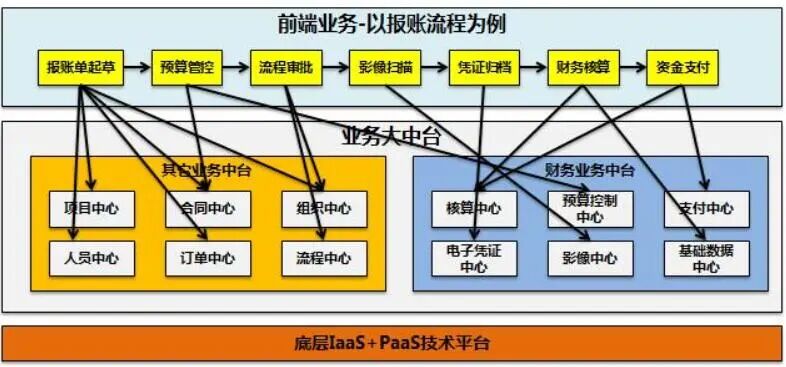 即通过构建中台可以进一步打破原有财务类单体业务系统安装报账,预算,资金等业务系统的构建模式,而进一步转变为以核心业务能力组件构建的新的微服务架构层构建模式。这种转变也是财务中台构建的一个关键点。