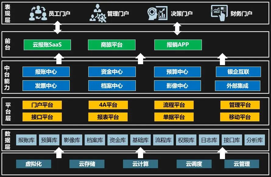 最后,虽然我们说财务中台,但是中台层边界应该是模糊的,应该是企业大中台的概念,要明白只有财务中台模块,财务核心流程,类似报账流程也是无法正常运作的。真正要成功运行还需要外部类似合同,订单,人员多个中台模块提供能力才能够实现财务报账的全流程。