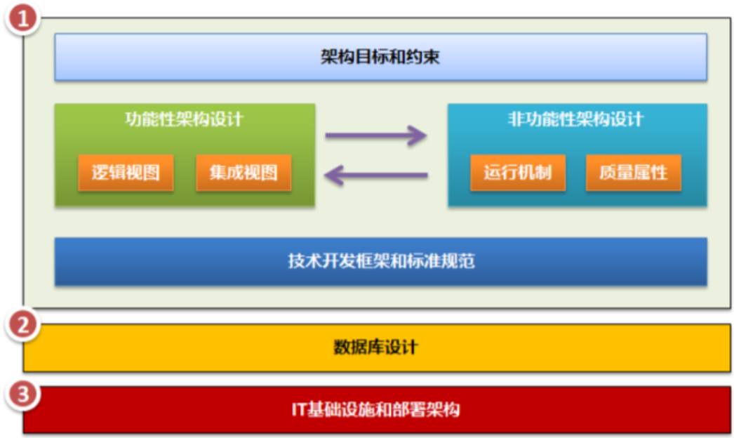 架构设计包括了功能性架构和技术架构设计两个部分的内容,功能性架构解决业务流程和功能问题,而技术架构解决非功能性需求等问题。两种架构都包括了动态和静态两个方面的内容,对于功能性架构中动态部分为业务流程驱动全局用例,用例驱动的用例实现等;对于技术架构中动态部分为架构运行机制,而静态部分为框架,分层等方面的内容。