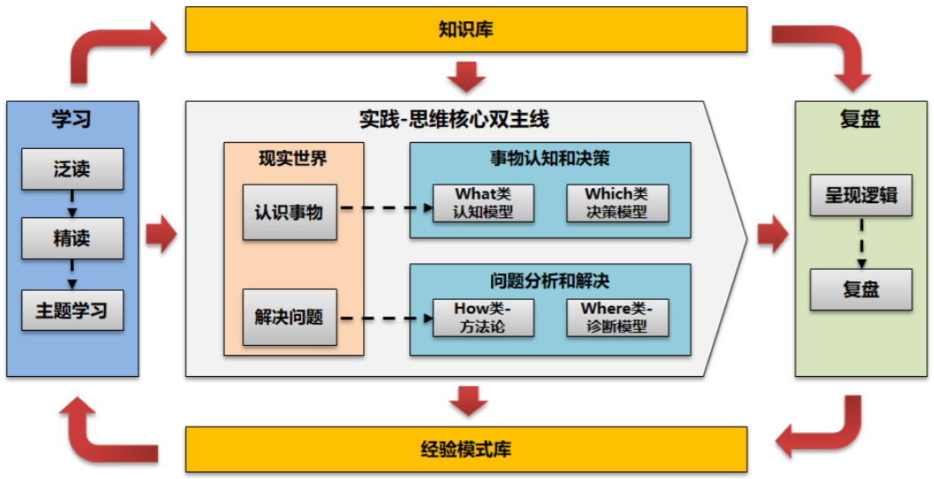 作为个体成长,可以看到始终就是一个不断的学习实践,认识和理解事物,分析和解决问题的持续迭代过程,在这个过程中我们不断的积累自己的知识库,做事情的方法和模式。而以上这些都属于思维方面的内容。