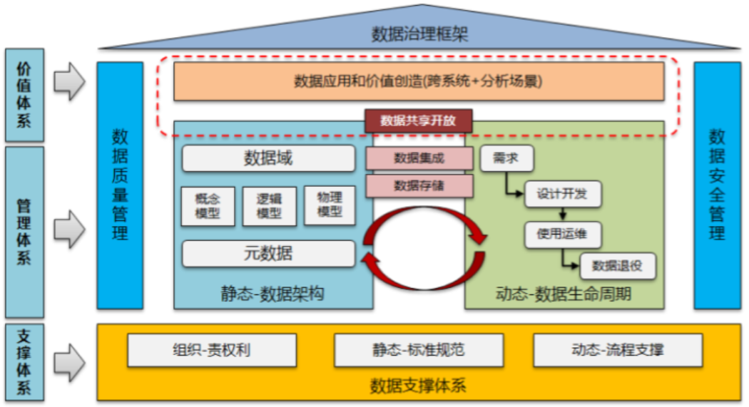 对于数据管理体系本身又应该围绕静态和动态两个维度来思考,在静态维度重点是数据对象和数据架构,而在动态维度重点是数据全生命周期管理。数据管理最终是将数据沉淀为资产开放和共性,让数据产生价值。