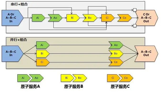 要明白服务之间的连接本质是输入和输出之间的连接和映射。以三个原子服务全部是查询服务,我们希望组装一个新服务,一次返回A,B,C三个服务查询结果,这个场景来举例说明。