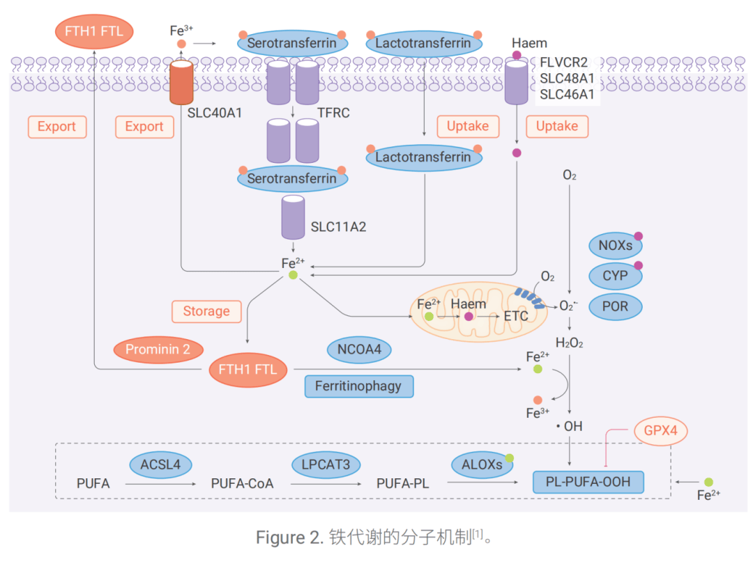 此外,乳铁蛋白 (Lactotransferrin)和血红素(Haem)通过细胞膜中的不同吸收途径提供额外的铁来源。另外, 铁储存蛋白复合物(FTH1/FTL)可通过 NCOA4介导的自噬被降解(Ferritinophagy),从而增加 Fe2+ 的水平。
