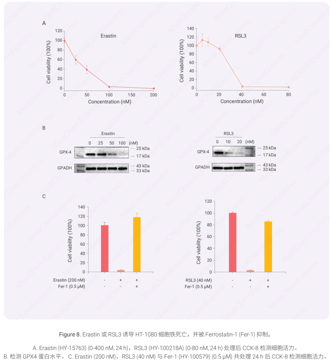 铁死亡与多种疾病都有密切的关系,如癌症、神经退行性疾病、急性肾功能衰竭等。高通量筛选是小分子 药物开发的重要方法,可以快速有效的得到先导化合物。MCE 铁死亡化合物库 (HY-L051) 集合了 1,000+ 种 文献报道的具有诱导或抑制铁死亡相关的化合物及与铁死亡密切相关的靶点对应的化合物,可以用于 铁死亡机制及相关疾病的研究。