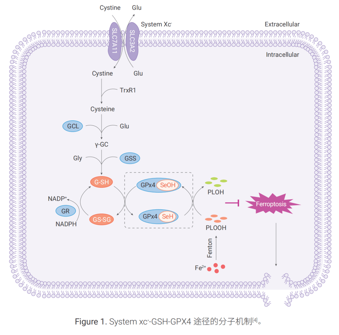 Fe2+ 可通过芬顿反应产生大量的磷脂氢过氧化物(PLOOH)。谷胱甘肽过氧化物酶(GPX4)能够利用 GSH 将 PLOOH 还原为脂质醇(PLOH),从而保护细胞免于铁死亡。具体而言,在 GPX4 的催化循环中, 硒醇(-SeH)是 GPX4 的主要活性基团,GSH 是 GPX4 的主要还原性辅因子,-SeH 被 PLOOH 氧化成硒酸 (-SeOH),GSH 可以还原 -SeOH 并进一步激活 GPX4,释放 GS-SG 以防止 GPX4 失活。GS-SG 在谷胱甘肽还原酶(GR)和辅酶 NADPH 的作用下被还原为 G-SH。