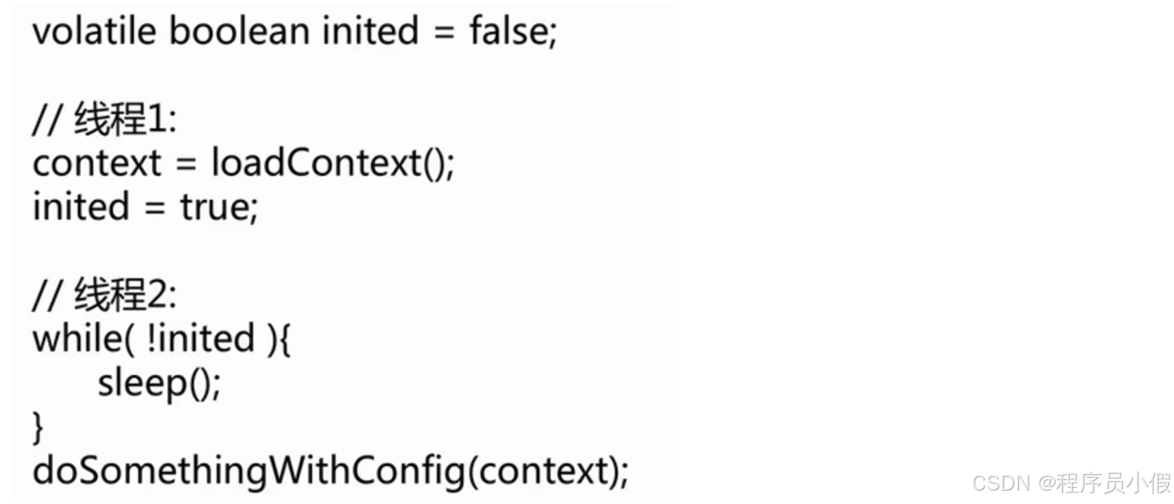 线程1负责初始化,线程2不断查询inited值,当线程1初始化完成后,线程2就可以检测到inited为true了。