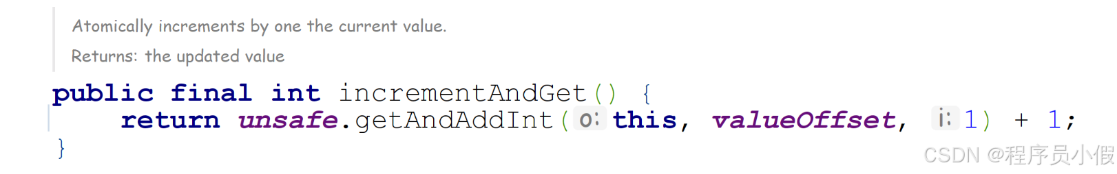 再重新看getAndAddInt(),传来第一个值是当前的一个对象 ,比如是count.incrementAndGet(),那么在getAndAddInt()中,var1就是count,而var2第二个值是当前的值,比如想执行的是2+1=3操作,那么第二个参数是2,第三个参数是1 。