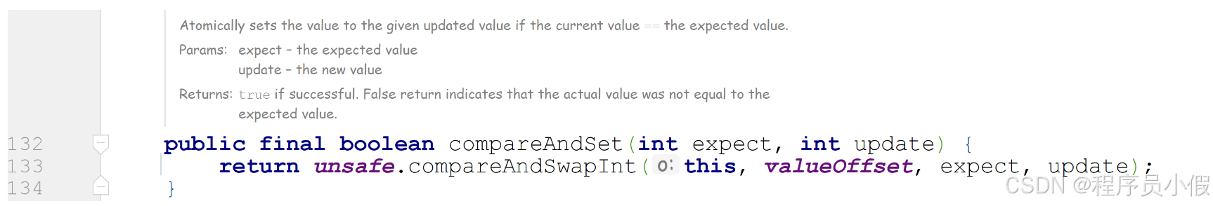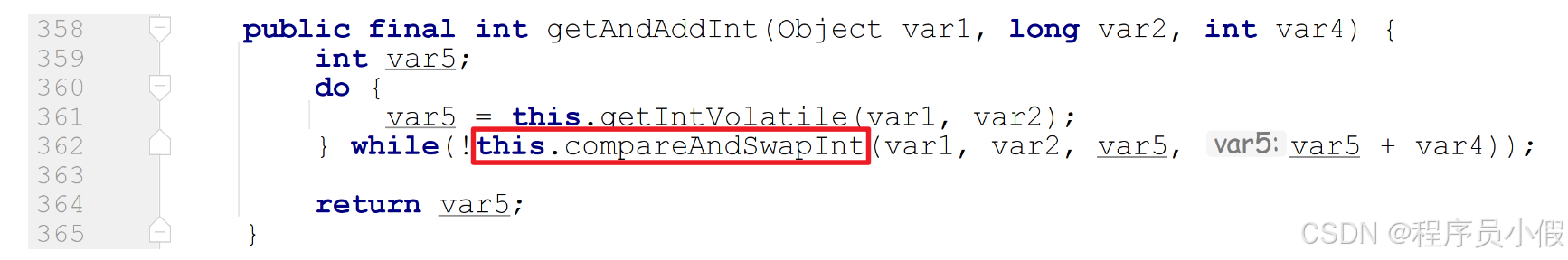 compareAndSwapInt()希望达到的目标是对于var1对象,如果当前的值var2和底层的值var5相等,那么把它更新成后面的值(var5+var4).