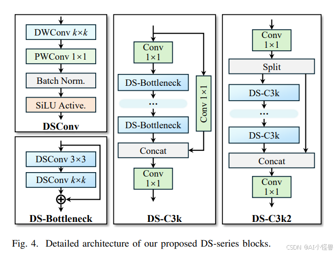 在我们提出的 YOLOv13 中,我们采用大核深度可分离卷积(DSConv)作为基本单元来设计一系列轻量化的特征提取模块,如图 4 所示,这显著减少了参数数量和计算复杂度,同时没有降低模型性能。