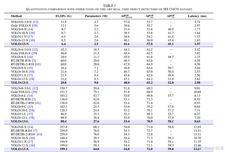 论文:[2506.17733] YOLOv13: Real-Time Object Detection with Hypergraph-Enhanced Adaptive Visual Perception摘要—YOLO 系列模型因其卓越的准确性和计算效率在实时目标检测领域占据主导地位。然而,无论是 YOLO11 及更早版本的卷积架构,还是 YOLOv12 引入的基于区域的自注意力机制,都仅限于局部信息聚合和成对相关性建模,缺乏捕捉全局多对多高阶相关性的能力,这限制了在复杂场景下的检测性能。本文提出了一种准确且轻量化的 YOLOv13 目标检测器。为应对上述挑战,我们提出了一种基于超图的自适应相关性增强(HyperACE)机制,通过超图计算自适应地利用潜在的高阶相关性,克服了以往方法仅基于成对相关性建模的限制,实现了高效的全局跨位置和跨尺度特征融合与增强。随后,我们基于 HyperACE 提出了全链路聚合与分配(FullPAD)范式,通过将相关性增强特征分配到整个网络,有效实现了全网的细粒度信息流和表征协同。最后,我们提出用深度可分离卷积代替常规的大核卷积,并设计了一系列块结构,在不牺牲性能的前提下显著降低了参数量和计算复杂度。我们在广泛使用的 MS COCO 基准测试上进行了大量实验,结果表明,我们的方法在参数更少、浮点运算量更少的情况下达到了最先进性能。具体而言,我们的 YOLOv13-N 相比 YOLO11-N 提升了 3.0% 的 mAP,相比 YOLOv12-N 提升了 1.5% 的 mAP。