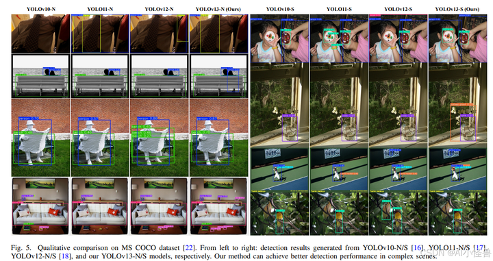 图 5 展示了在 MS COCO 数据集上的定性比较结果。我们提出的 YOLOv13 模型与现有的 YOLOv10[16]、YOLO11[17] 和 YOLOv12[18] 模型进行了比较。从图中可以看出,我们的 YOLOv13 模型在复杂场景中能够实现更准确的检测性能。具体而言,如图 5 左侧最后一行所示,我们的 YOLOv13-N 模型能够在复杂的多目标场景中准确检测物体。相比之下,之前的模型会遗漏像碗和花瓶这样的小物体。这是由于我们提出的 HyperACE 能够在多个相关物体之间建立高阶关联,从而在复杂场景中准确检测多个目标。如右侧第二行所示,只有我们的方法成功检测到了花瓶后面的植物,这是一种具有挑战性的情况。直观来看,花瓶和植物之间的关联性很强,这导致植物出现的概率很高。我们的方法可以通过挖掘这种潜在关联来实现准确检测。如右侧第三行所示,我们的方法能够准确检测运动员持有的网球拍,而之前的方法要么遗漏了它,要么错误地检测到了阴影。这些定性结果证明了我们提出的方法的有效性。