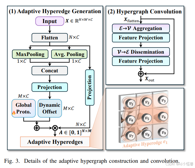 1)自适应超图计算:为高效、有效地建模视觉特征的高阶关联,并实现关联指导的特征聚合与增强,我们提出了一种新颖的自适应超图计算范式。与传统超图建模方法不同,后者使用手动预定义的参数基于特征相似性构造超边,而我们的方法则自适应地学习每个顶点在每个超边中的参与度,使这种计算范式更加鲁棒和高效。传统超图计算范式更适用于包含明确连接关系的非欧几里得数据(例如社交网络),而我们的自适应超图计算范式更有利于计算机视觉任务。