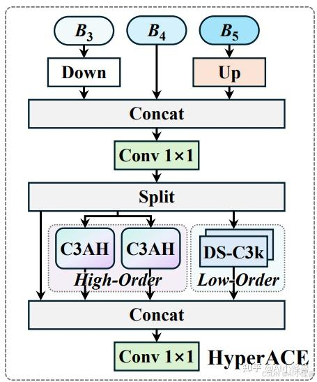 为实现高效且鲁棒的跨尺度跨位置关联建模和特征增强,我们提出了一种基于超图的自适应关联增强机制。如图 2 所示,HyperACE 包含两个核心组件,即基于 C3AH 模块的全局高阶感知分支,该分支利用自适应超图计算以线性复杂度建模高阶视觉关联,以及基于 DS-C3k 模块的局部低阶感知分支。在接下来的子部分中,我们将分别介绍自适应超图计算、C3AH 模块以及 HyperACE 的整体设计。