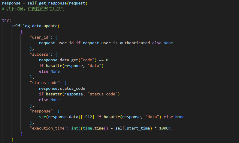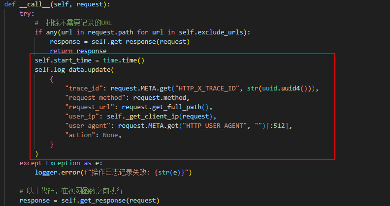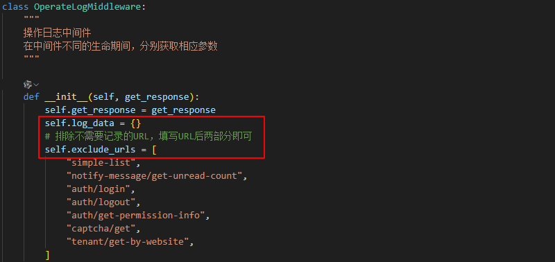 OperateLogMiddleware,方法__init__()中,添加exclude_urls排除不需要记录的URL的列表,和一个字典log_data用于临时存放日志信息。