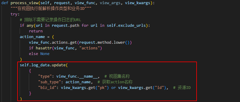 process_view()中间件钩子函数中,向字典log_data记录视图名称、Action名称、资源ID
