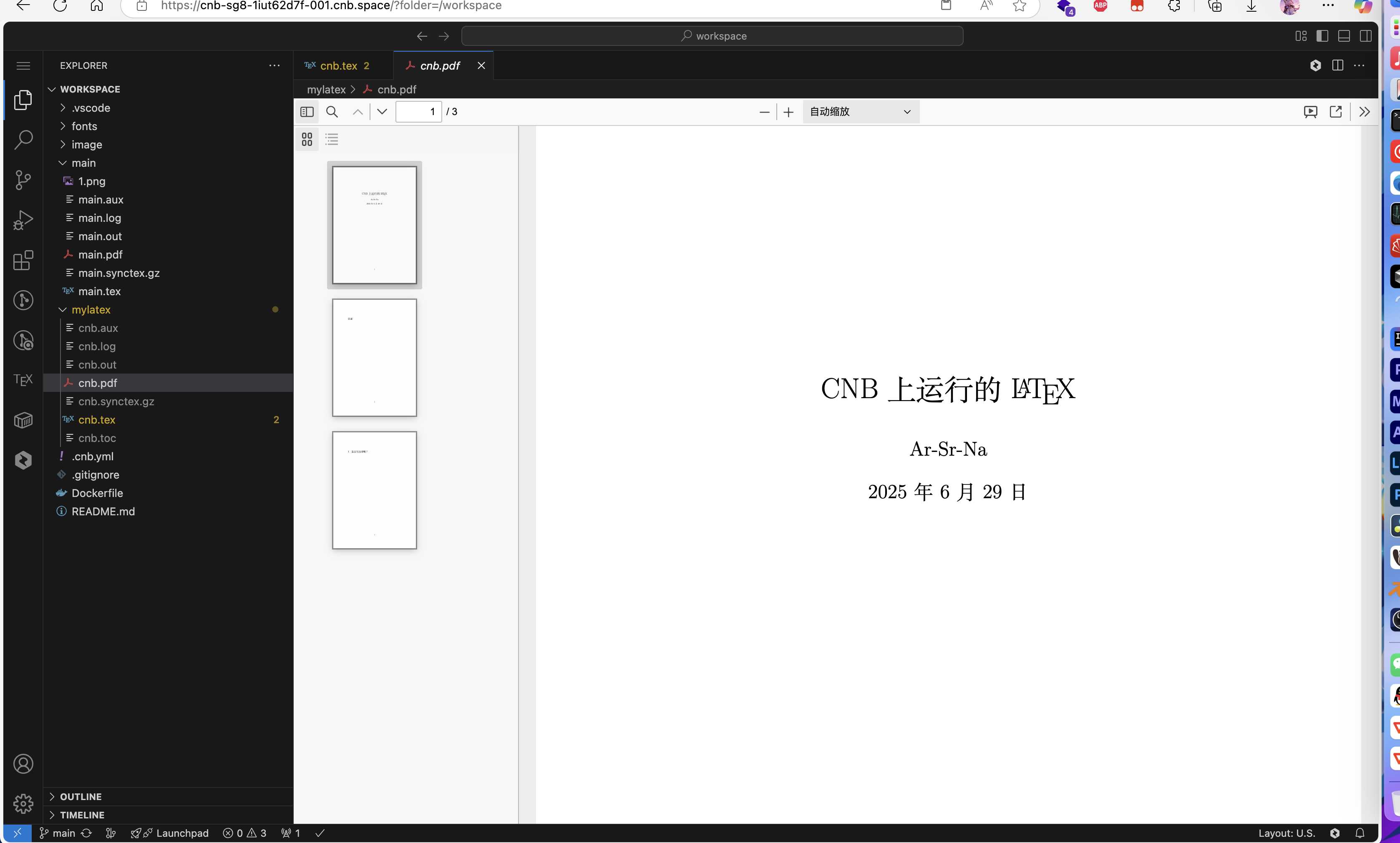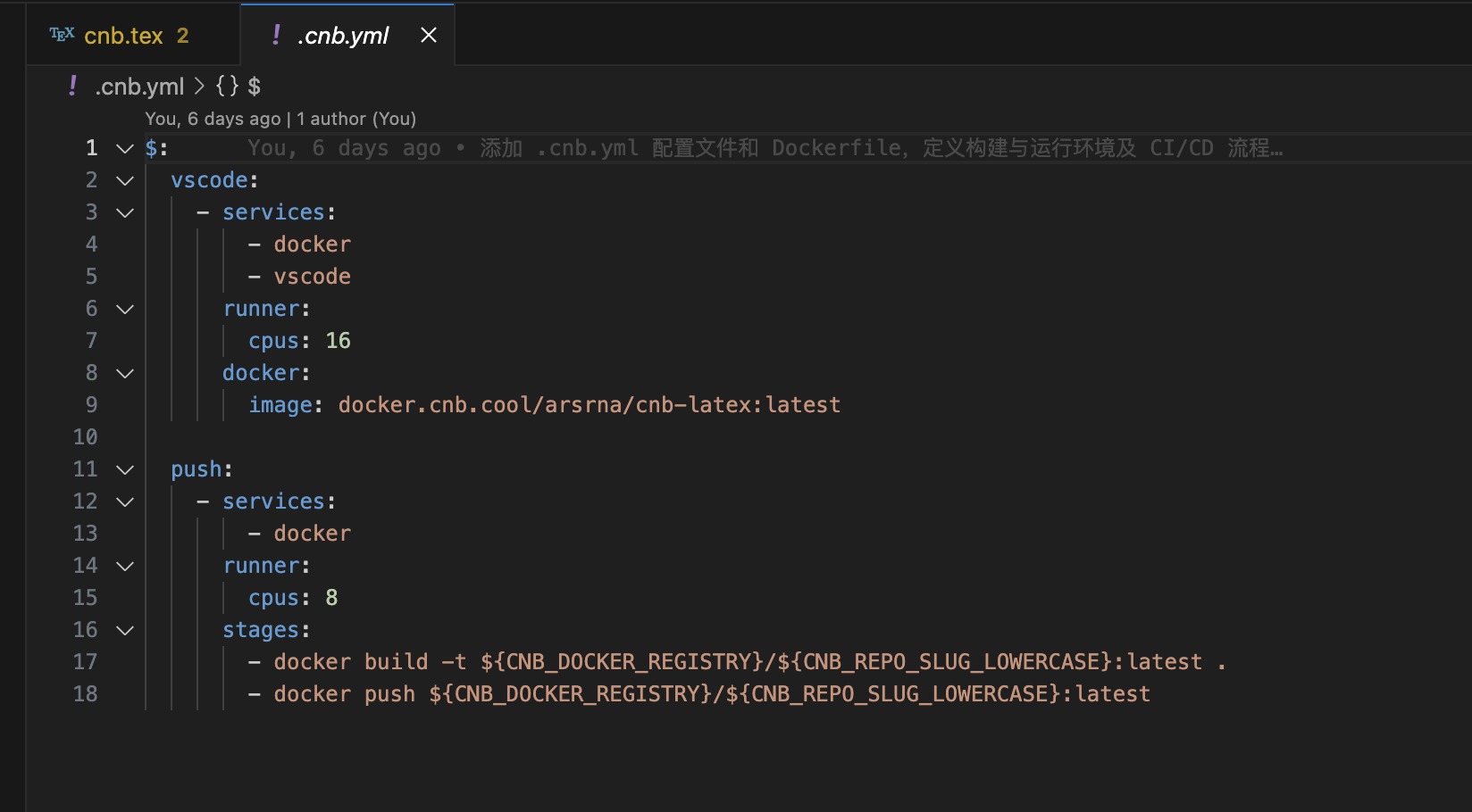 文章写完后,使用git功能,把tex编辑的内容commit+push,就可以保存到cnb上了,下次再使用同样的方法进入,找到那个文件接着编译即可。
