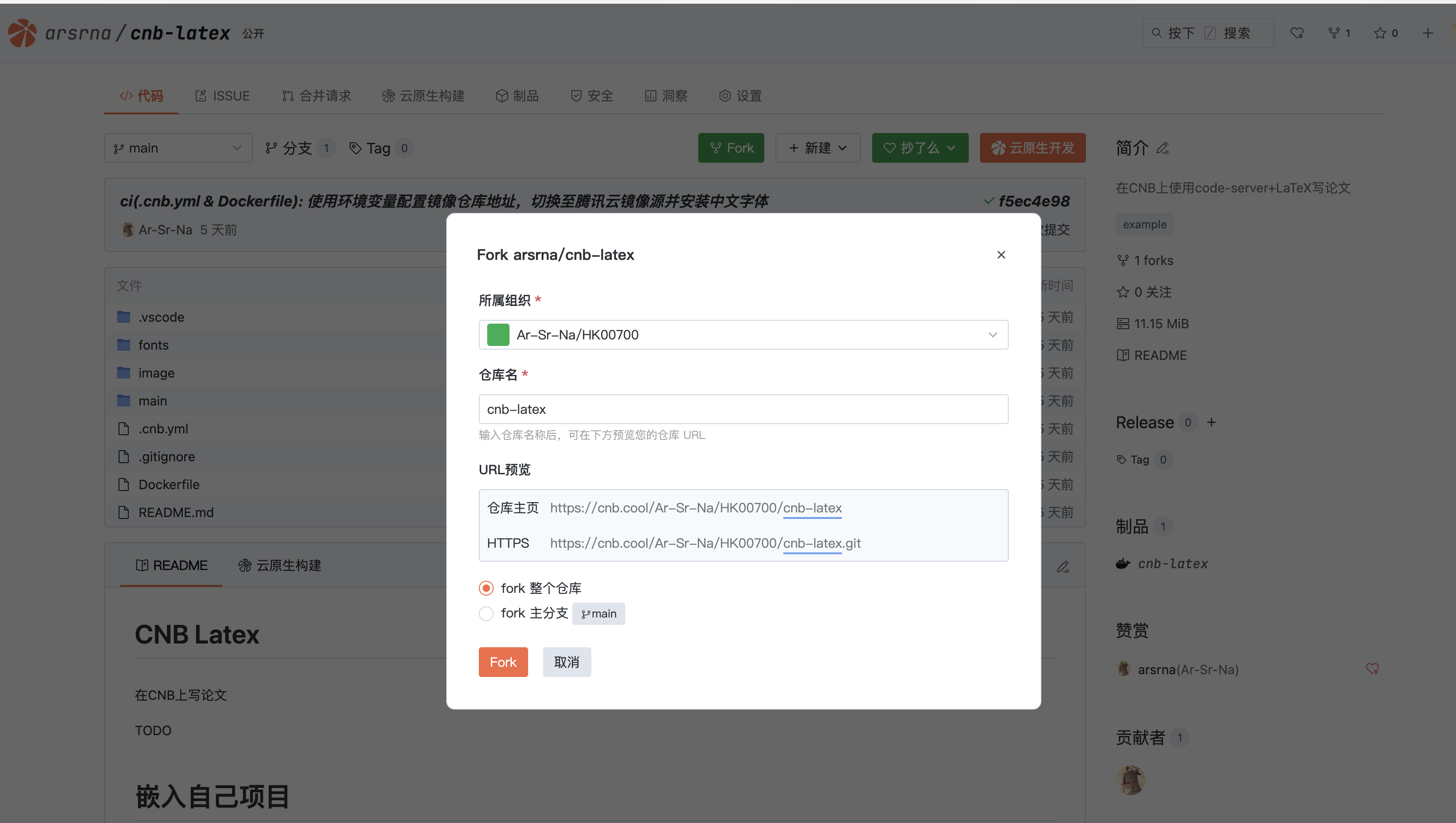 直接进入项目,fork到自己的仓库下。我已经安装了全部texlive包,以及常用中文字体,可以通过fc-list查询。常用的推荐SIMSUN,kaiti_GB2312宋体和黑体。