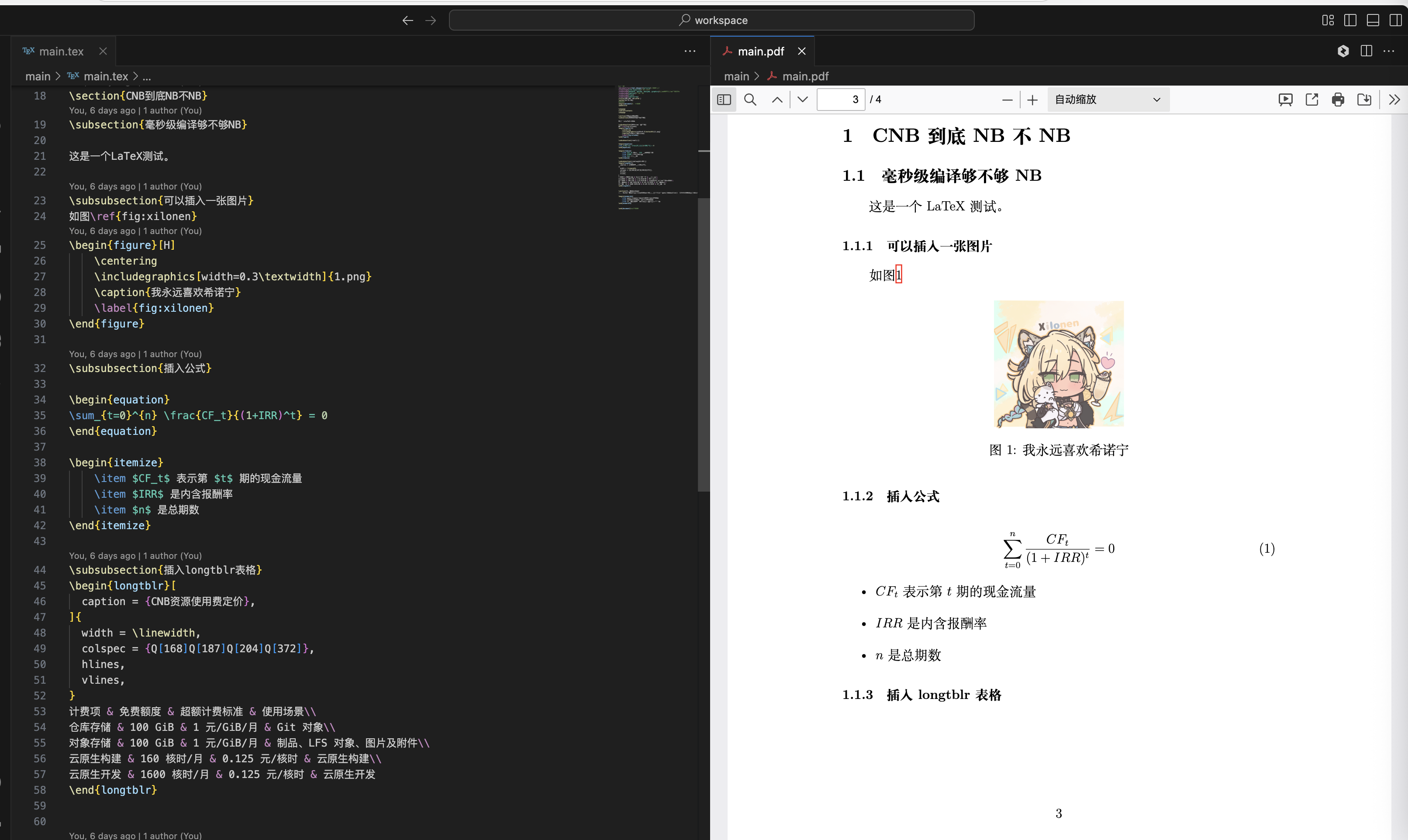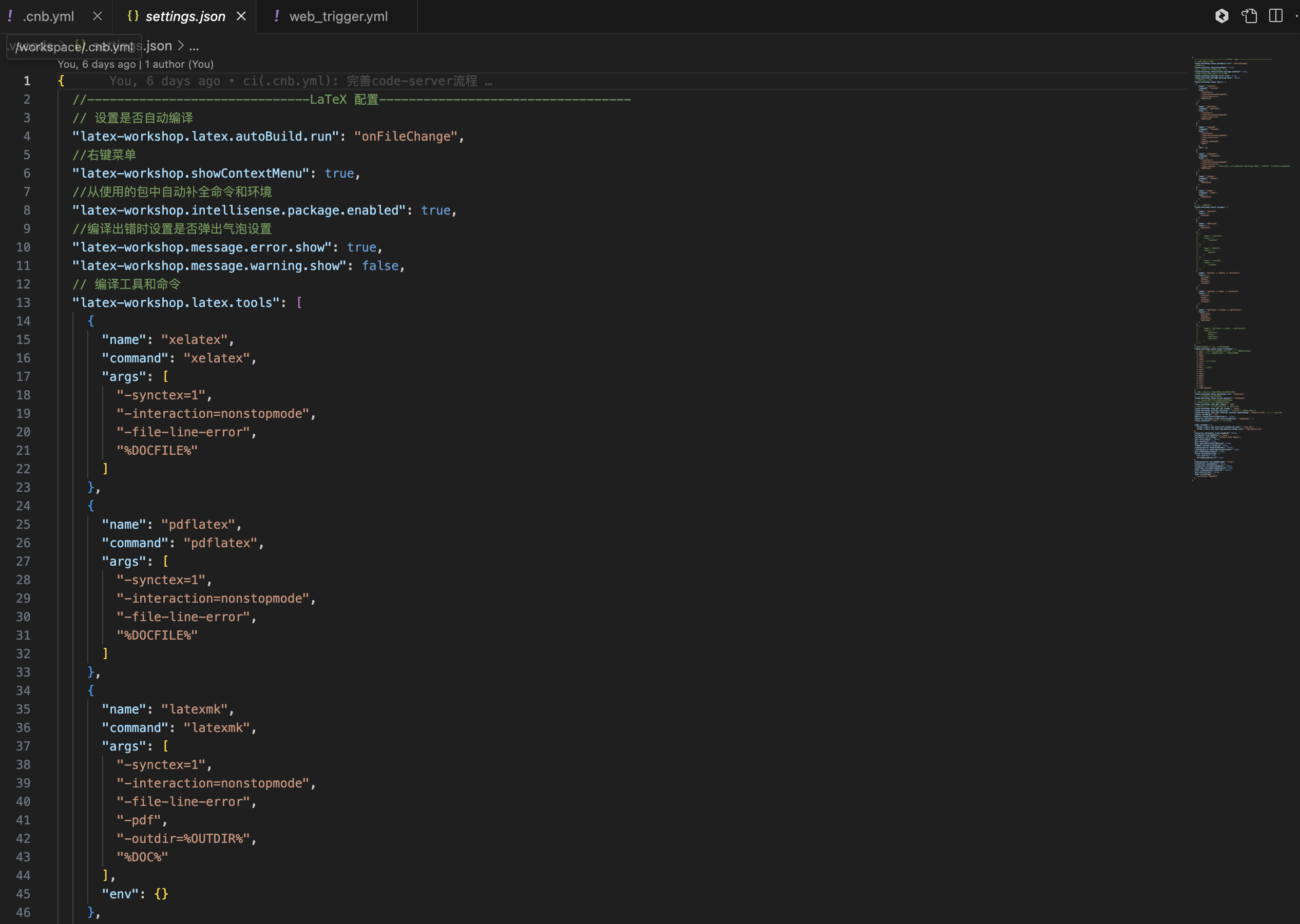 在.vscode/settings.json 里面对设置做了介绍,我也对texlive做了设置,适配了XeTeX中文环境,更多的可以参考文件内注释。